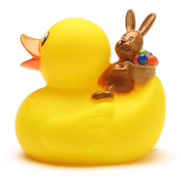 Stell dir vor, wie diese fröhliche Quietscheente mit ihrem niedlichen Osterhasen-Freund auf dem Rücken in deiner Badewanne umherschwimmt. Die leuchtend gelbe Badeente mit ihrem treuen braunen Hasen, der einen Korb voller bunter Eier hält, bringt die Osterfreude direkt zu dir nach Hause. Ein quietschvergnügtes Duo, das in keinem Osternest fehlen darf!