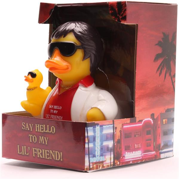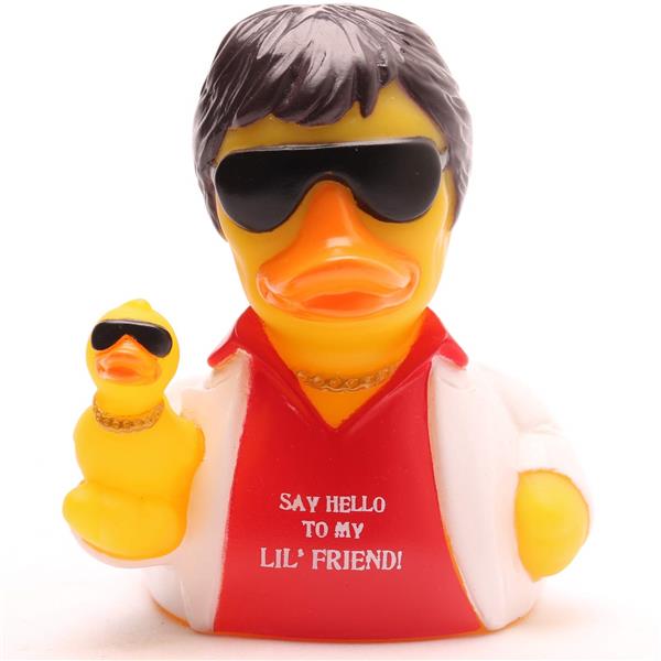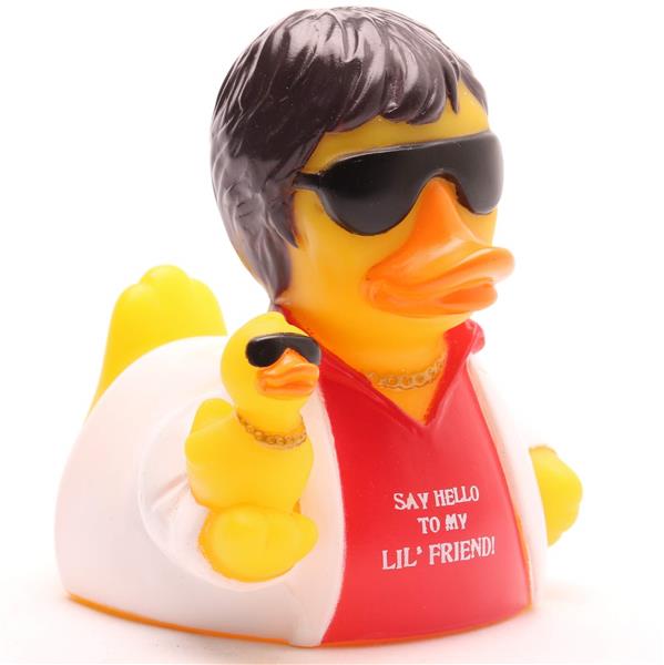 Bringe eine Prise Miami-Glamour und ein bisschen Badaction in dein Badezimmer mit der "Say Hello to my Lil' Friend" Badeente! Diese coole Badeente ist eine lustige Hommage an die berühmten Gangsterfilme und bringt mit ihrem stylischen Look und der witzigen kleinen Ente in der Hand garantiert Spaß in die Badewanne. Komplett mit Sonnenbrille, weißem Anzug und der ikonischen Aufschrift auf dem Hemd ist diese Ente bereit, die Badeszene zu erobern!