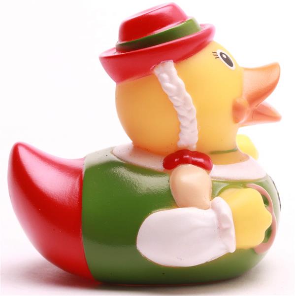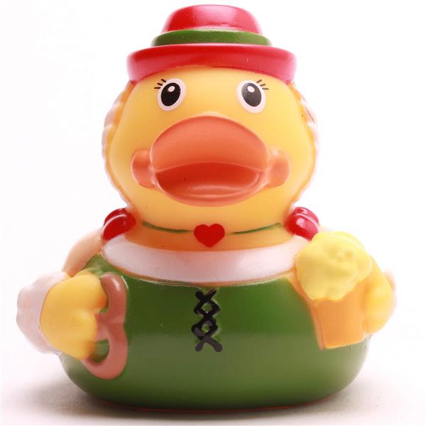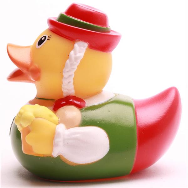 O’zapft is – jetzt auch in der Badewanne! Diese fröhliche Badeente kommt im klassischen Dirndl-Look daher und bringt echtes Oktoberfest-Feeling ins Wasser. Mit geflochtenen Zöpfen, rotem Hütchen und grünem Kleid ist sie ein echter Hingucker. Dazu trägt sie stilecht eine Maß Bier in der einen und eine Brezn in der anderen Hand – so wird aus der Quietscheente ein echtes Festtags-Highlight.