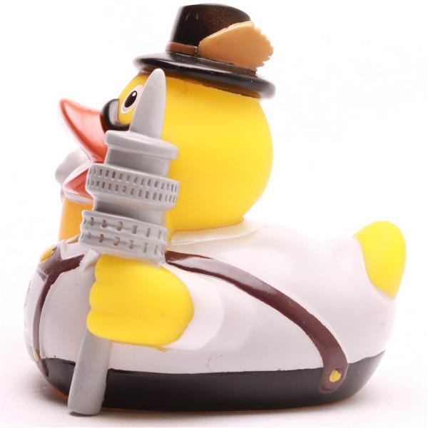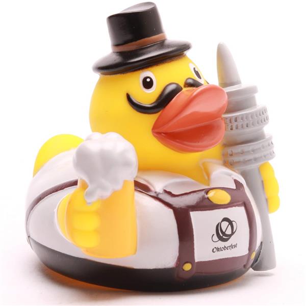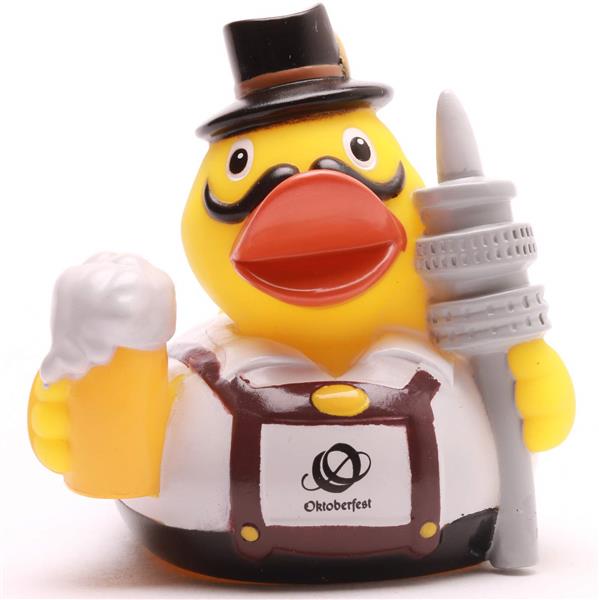 Diese Quietscheente ist ein Prosit auf die bayrische Lebensfreude! Die Oktoberfest Badeente „München“ trägt nicht nur stilecht eine traditionelle Tracht, sondern hält auch eine frisch gezapfte Maß Bier in der einen und den Münchner Olympiaturm in der anderen Hand – typisch München eben. Mit ihrem geschwungenen Schnauzbart, dem frechen Blick und dem schwarzen Hut samt Hutschmuck bringt sie das urbane Wiesn-Feeling direkt in deine Wanne.