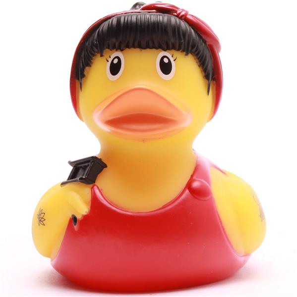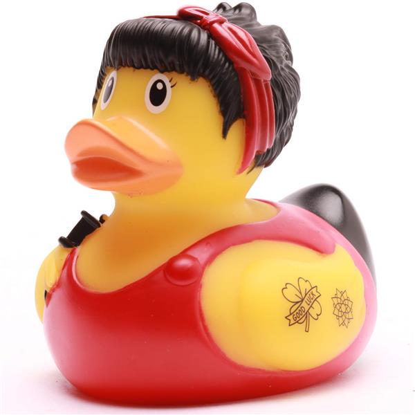 Die "Tattoo Badeente" bringt richtig viel Rock’n’Roll in dein Badezimmer! Diese Ente ist definitiv nicht die typische Quietscheente von nebenan – nein, sie hat Style, sie hat Attitude und sie zeigt das auch. Mit ihrem coolen Tattoo-Design und der roten Bandana auf dem Kopf erinnert sie uns ein bisschen an die klassische Rockabilly-Ära. Die Tattoos auf ihren Flügeln zeigen, dass sie nichts anbrennen lässt: Ein glänzender Diamant mit dem Schriftzug „Famous“ und ein kleines Blümchen – perfekt, um zu zeigen, dass sie ein echter Bad-Ass ist, aber auch eine weiche Seite hat.