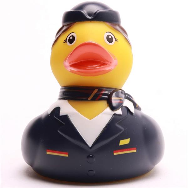 Diese Stewardess Badeente bringt den perfekten Mix aus Stil und Abenteuerlust in dein Badezimmer. Mit ihrem dunkelblauen Kostüm, dem passenden Käppchen und dem elegant gemusterten Halstuch verkörpert sie den klassischen Look einer Flugbegleiterin – bis ins kleinste Detail. Selbst die kleinen Abzeichen in den Farben Schwarz-Rot-Gold auf der Uniform fehlen nicht und machen dieses Quietscheentchen zu einem echten Hingucker.