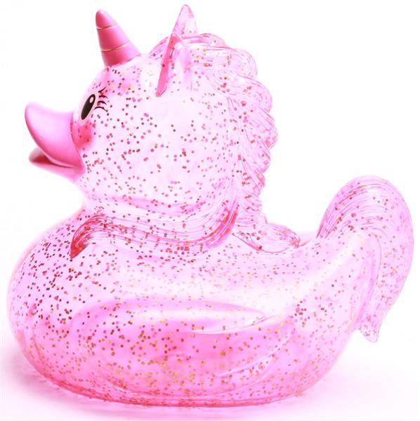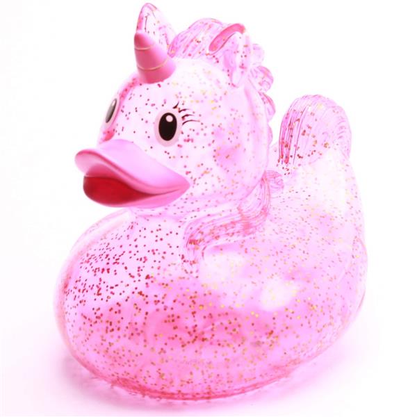 Diese Badeente ist ein echter Hingucker für alle, die es märchenhaft und verspielt lieben. Das Glitzer-Einhorn in strahlendem Pink vereint die Form einer klassischen Badeente mit dem Charme eines Einhorns. Mit seinem glänzenden Horn, der detailreichen Mähne und dem niedlichen Gesichtsausdruck bringt es sofort gute Laune ins Badezimmer. Besonders auffällig sind die vielen gold- und pinkfarbenen Glitzerpartikel, die im transparenten Kunststoff funkeln und der Ente eine magische Ausstrahlung verleihen.