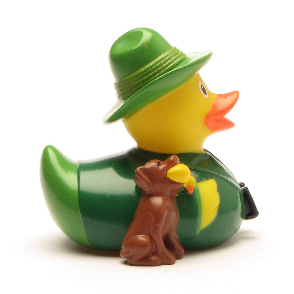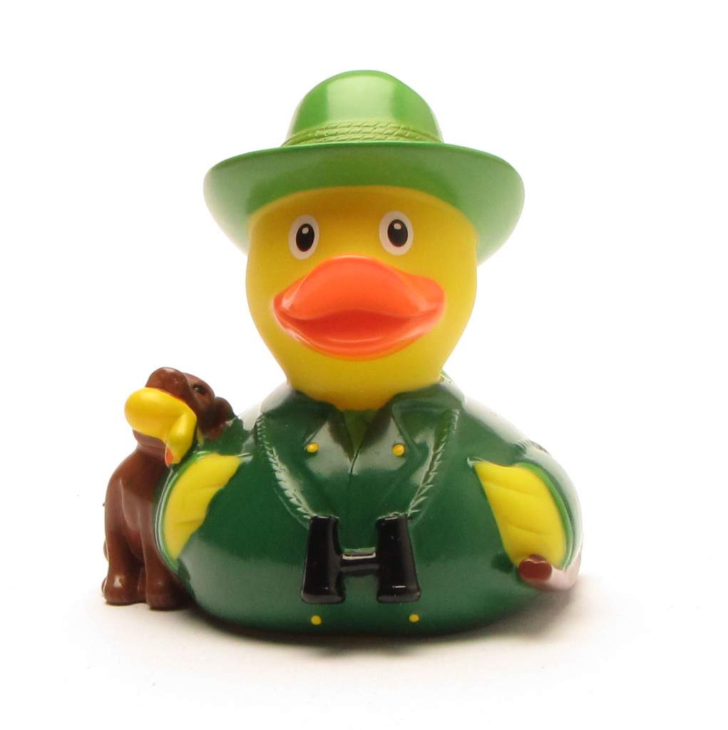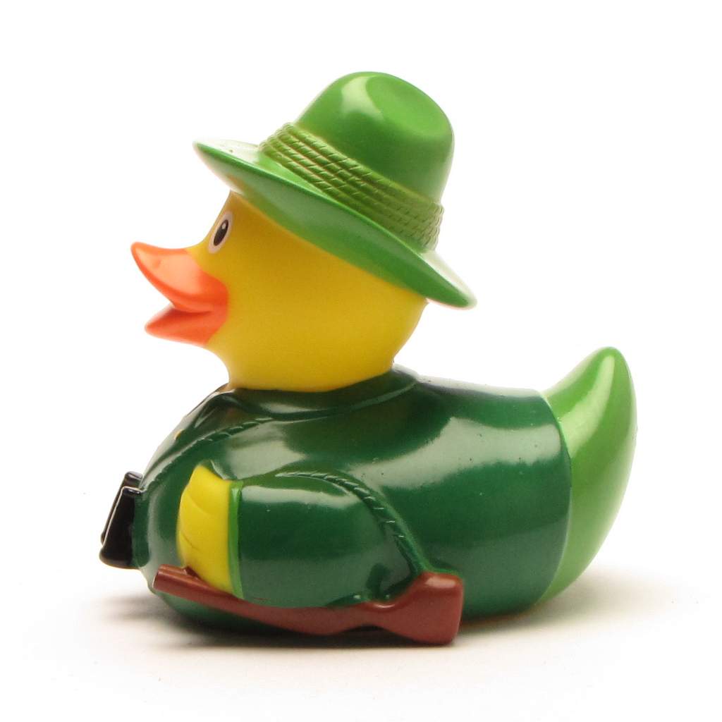 Egal wie klein diese Quietscheente auch wirken mag: Zusammen mit ihrem treuen Begleiter trifft sie immer das Ziel. Durch ihr Fernglas hat sie Augen wie ein Adler und durchblickt selbst den grünsten Wald, in dem sie sich dank ihres Outfits wunderbar tarnen kann. Ihre Flinte ist immer griffbereit. Dieser Jäger ist bestens vorbereitet. Also lasset die Jagd beginnen!