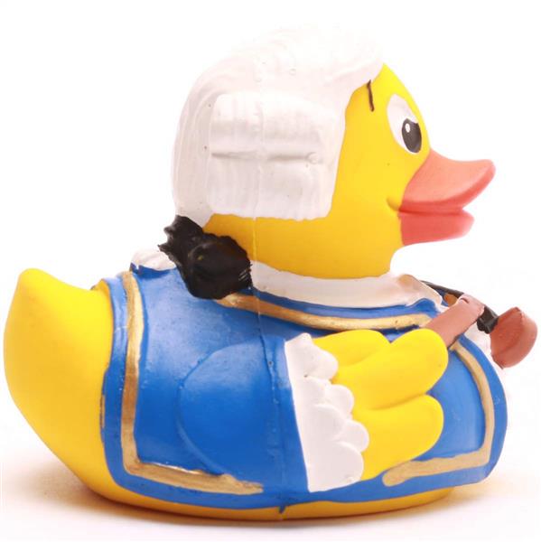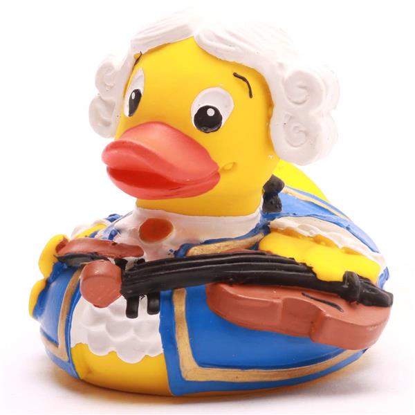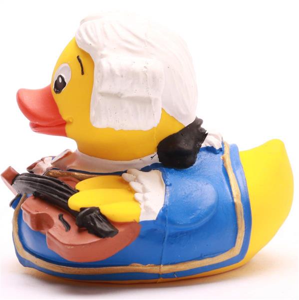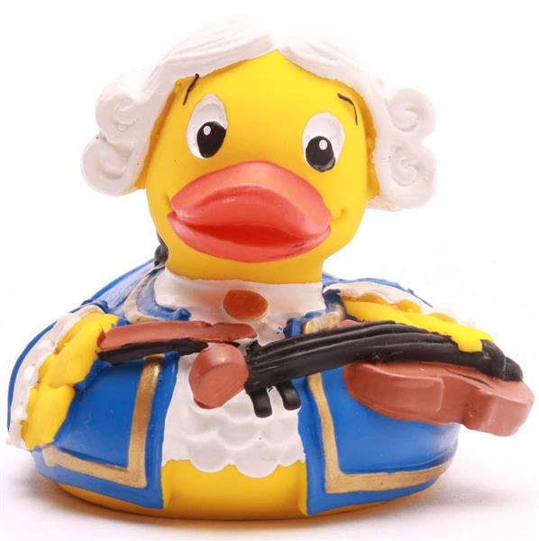 Die Mozart-Badeente bringt klassische Musik und charmanten Humor in Einklang. Inspiriert vom großen Komponisten Wolfgang Amadeus Mozart, zeigt sich diese besondere Badeente in einem prachtvollen Outfit, das direkt an die Wiener Klassik erinnert. Mit weiß gepuderter Perücke, aufwendigem blauen Frack und eleganten goldenen Verzierungen ist sie stilecht gekleidet wie ein Musiker des 18. Jahrhunderts. In ihren Flügeln hält sie eine Geige samt Bogen und scheint jeden Moment zu einem kleinen Konzert im Badezimmer ansetzen zu wollen.