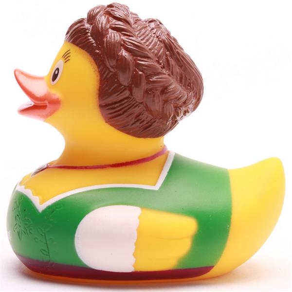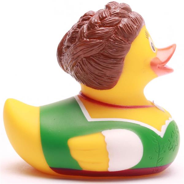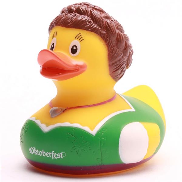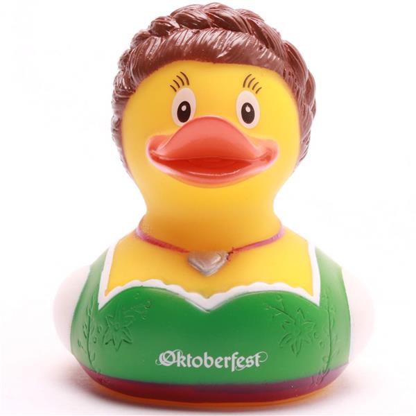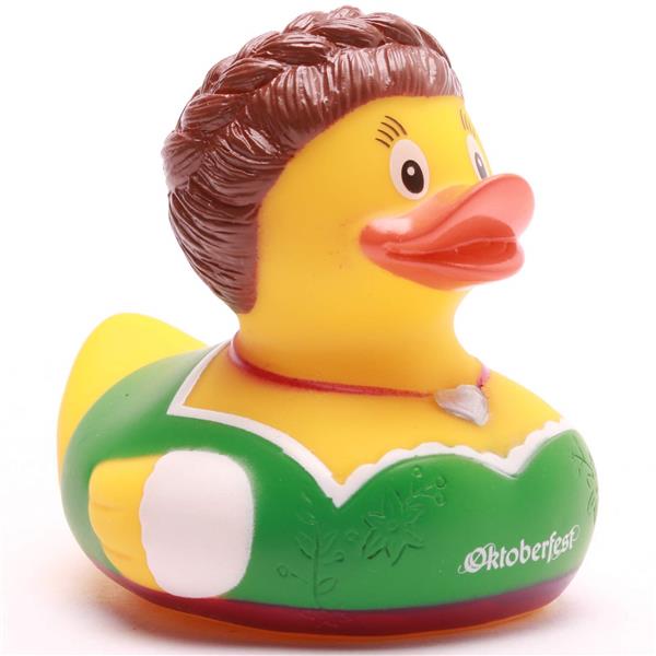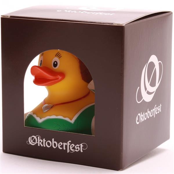 Bayrischer Charme trifft auf Badevergnügen: Die Oktoberfest Badeente „Dirndl“ ist der Star jeder Badewanne! In ihrem festlichen grünen Dirndl mit weißen Puffärmeln und aufwendig geflochtener Frisur bringt dieses Quietscheentchen echte Wiesn-Stimmung ins Haus. Das kleine Herzkettchen um ihren Hals und der „Oktoberfest“-Schriftzug auf dem Kleid sorgen für die Extraportion Detailverliebtheit.