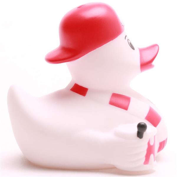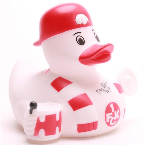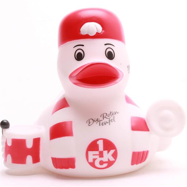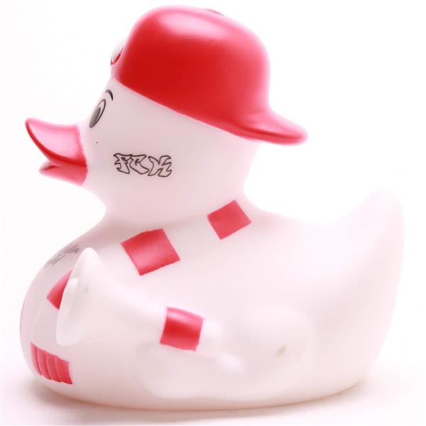Diese Ente hat ihr Herz auf dem rechten Flügel – und es schlägt rot-weiß! Die Gummientchen „Fan“ vom 1. FC Kaiserslautern bringen echten Betze-Spirit in euer Bad oder auf euren Schreibtisch. Mit roter Baseballkappe, Schal und Trommel zeigt sie stolz die Farben und das Logo dieses traditionsreichen Vereins. Auf ihrer Brust prangt der Schriftzug „Die Roten Teufel“, während ein kleines „FCK“-Tattoo auf ihrer Wange ihre Fanliebe unverkennbar macht.