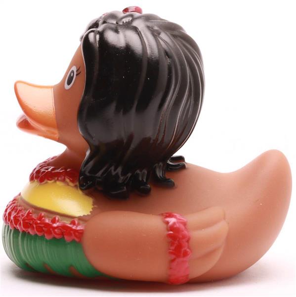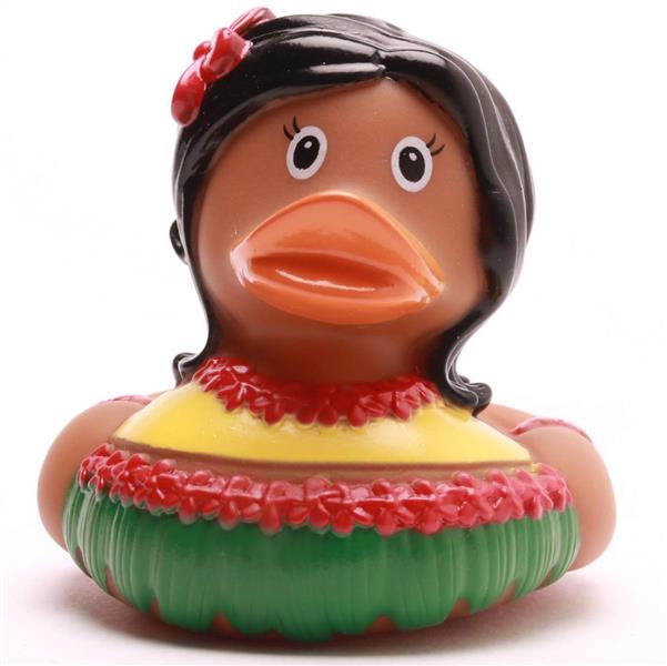 Aloha! Mit der Hawaiianerin-Badeente holst du dir exotisches Südsee-Feeling direkt in deine Badewanne. Diese charmante Ente trägt ein farbenfrohes Hula-Outfit mit rotem Blumenschmuck und einem grünen Baströckchen, das sofort tropische Urlaubsgefühle weckt. Ihre dunklen Haare werden elegant von einer kleinen roten Blüte geschmückt und verleihen ihr einen bezaubernden Look.