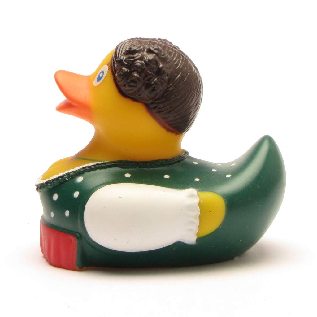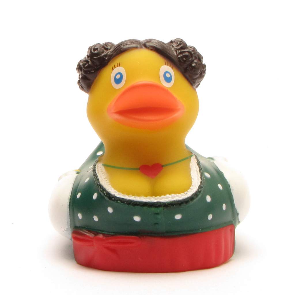 Diese Badeente sieht so aus, wie man sich ein bayrisches Madel auf dem Oktoberfest vorstellt. Mit Dirndl und ordentlich Holz vor der Hütten...