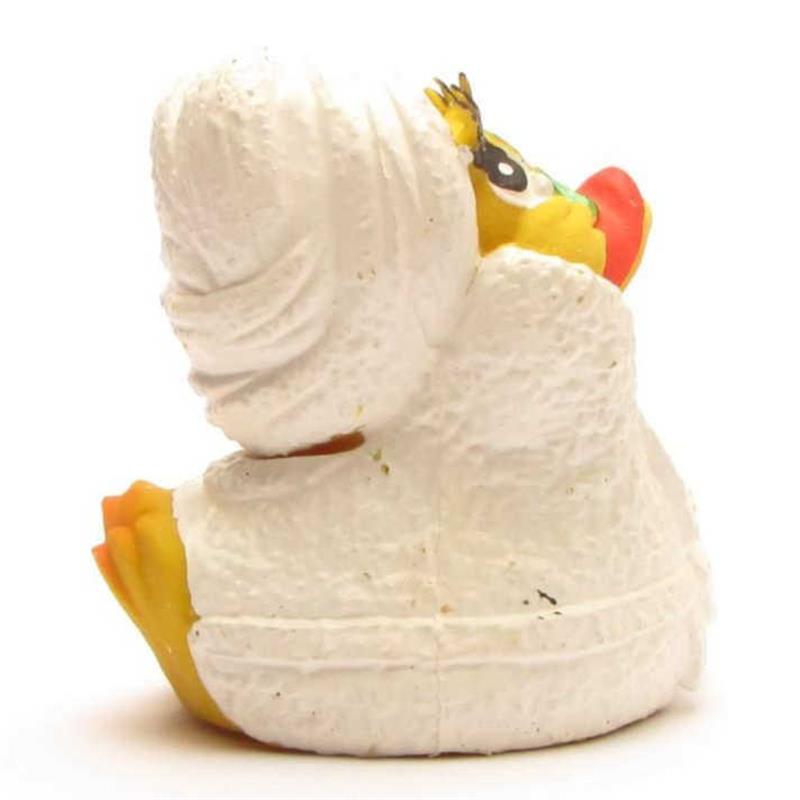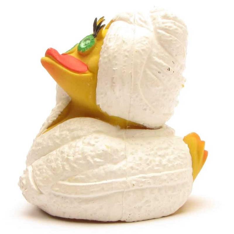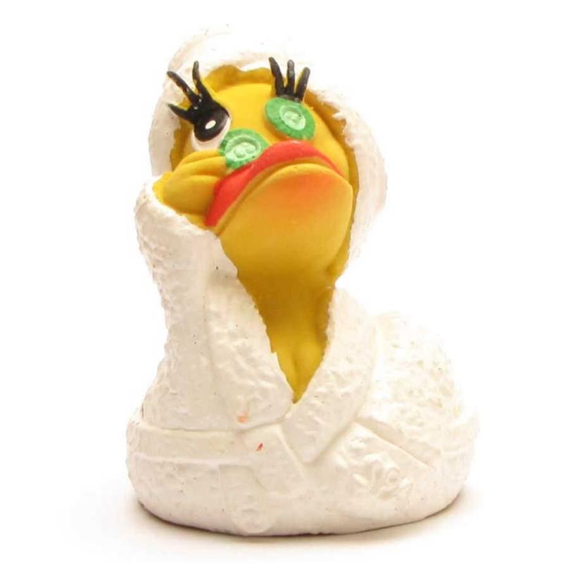 In einem weißen Bademantel, mit Handtuch um den Kopf gewickelt und Gurkenscheiben auf den Augen macht die Lanco Wellness Duck Quietscheente Lust auf eine kleine Auszeit in Form einer Beauty-Behandlung. Diese Badeente verwandelt ihre Badewanne in einen Spa.