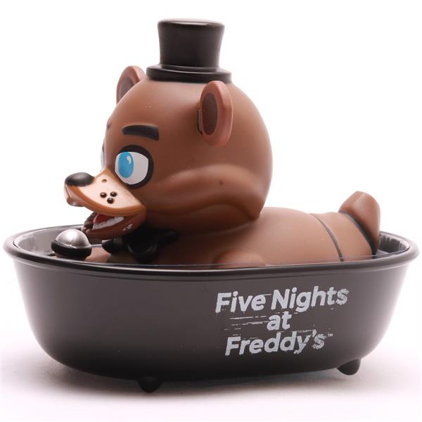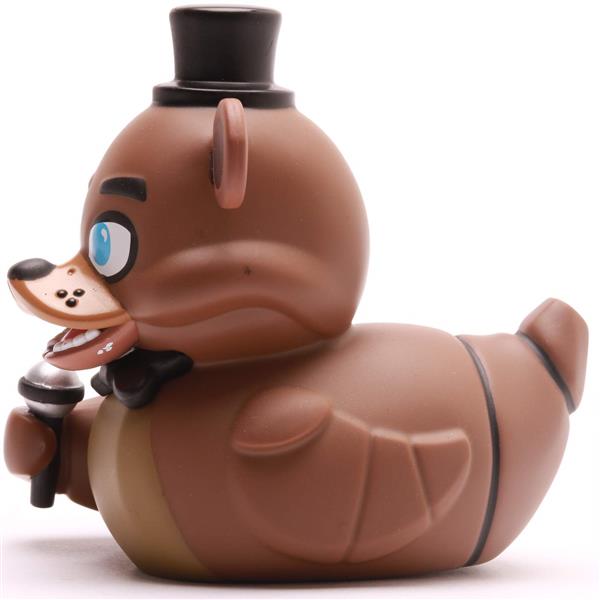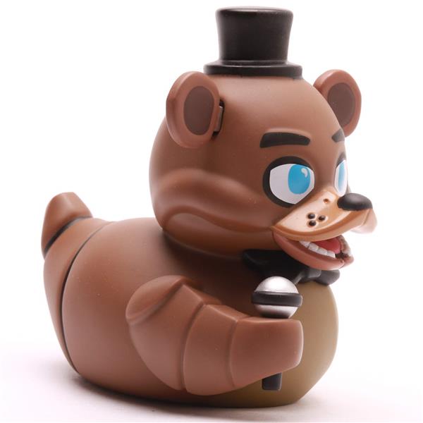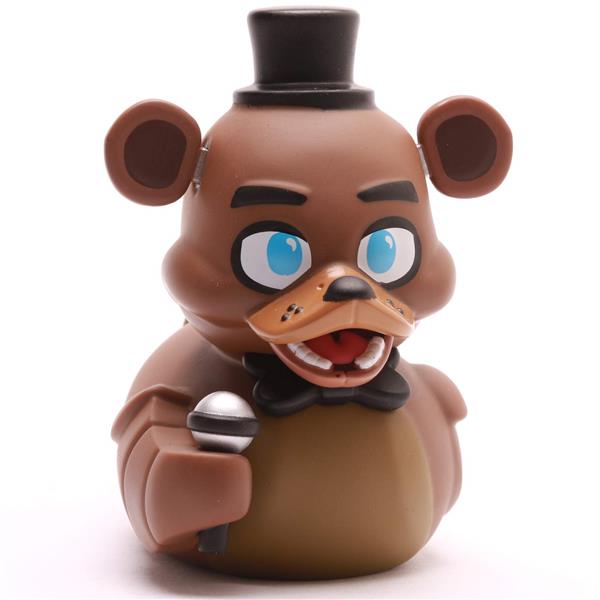Vorhang auf für Freddy, den ultimativen Animatronic-Bär im Badeenten-Kostüm! Mit Mikrofon in der Hand, Fliege am Hals und Melone auf dem Kopf sieht er aus wie der geborene Entertainer – oder sollte man sagen "Ente-tainer"? Freddy bringt das Flair von "Five Nights at Freddy's" direkt in dein Badezimmer und lässt selbst gruseligste Nächte mit einem Lächeln enden.