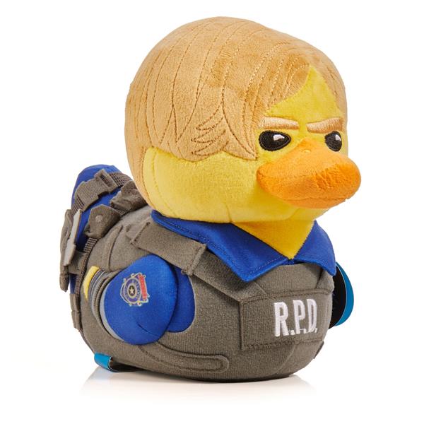 Das Plüschtier ist eine detailgetreue Nachbildung von Leons ikonischem Look aus der Resident-Evil-Reihe. Mit seinen charakteristischen blonden Haaren und der graublauen Uniform ist er sofort erkennbar. Das „R.P.D.“-Logo, das stolz auf seiner Weste prangt, ist für jeden echten Fan sofort erkennbar. Auch die kleine Ausrüstung auf seinem Rücken – die natürlich allesamt an die Größe einer Ente angepasst sind – zeigt seine ständige Einsatzbereitschaft.