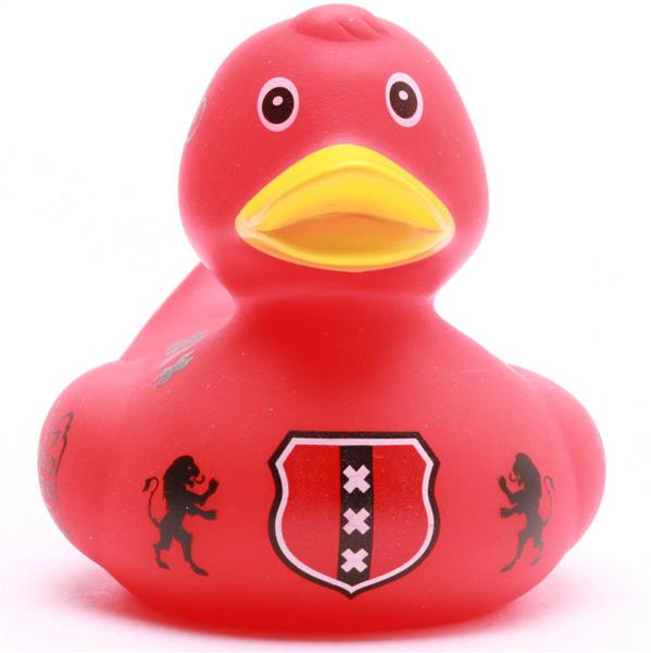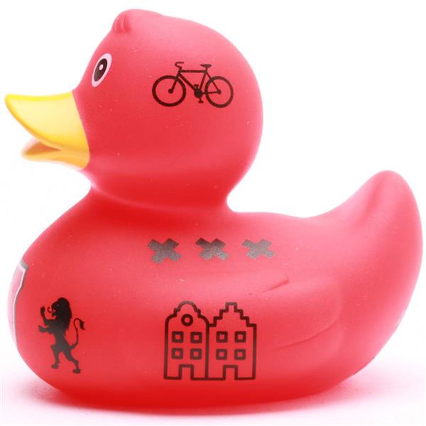 Die Badeente „I love Amsterdam“ ist die perfekte Hommage an die niederländische Hauptstadt und ein Muss für alle Fans von Grachten, Fahrrädern und urbanem Charme. Mit ihrem auffälligen roten Design, verziert mit typischen Symbolen wie den ikonischen Grachtenhäusern, den drei Andreaskreuzen des Amsterdamer Wappens, einem Fahrrad und einem majestätischen Löwen, bringt sie die Essenz der Stadt direkt in dein Badezimmer.