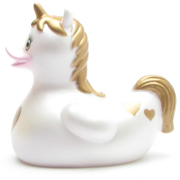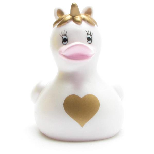 Hallo, Du magischer Entenfreund! Darf ich Dir die absolut einzigartige, bezaubernde und phantastische Einhorn Badeente vorstellen? Weiß wie die reinsten Wolken und geschmückt mit einem goldenen Herz auf der Brust, verzaubert sie jedes Bad in ein magisches Abenteuer. Ihr Schweif? Ein funkelndes Gold, das jeden Regenbogen vor Neid erblassen lässt. Hergestellt aus hochwertigem Vinyl, ist diese Quietscheente ein echtes Schmuckstück, das sogar den härtesten Badespaß übersteht.
