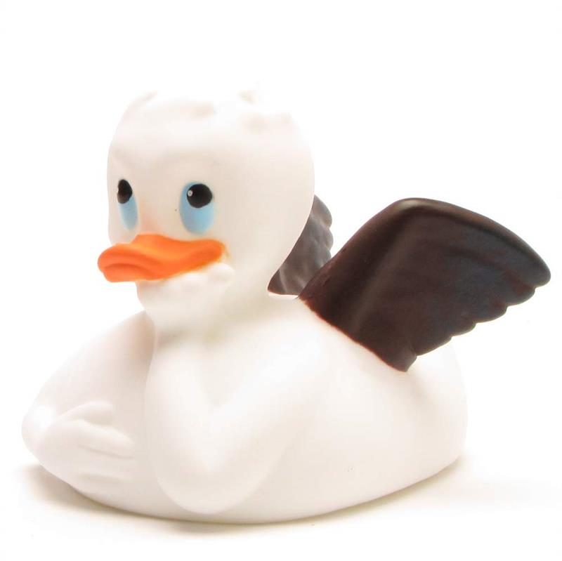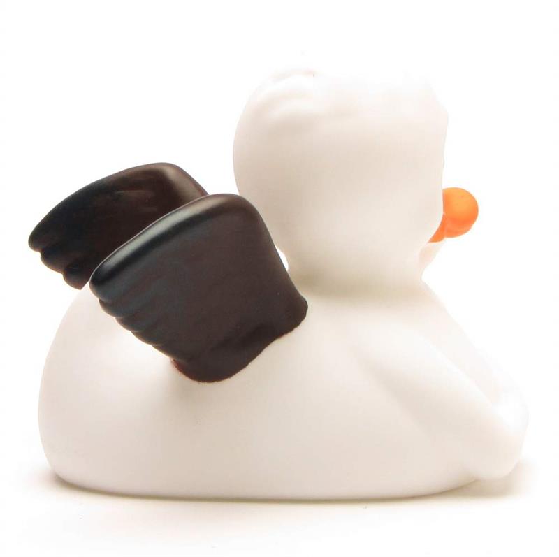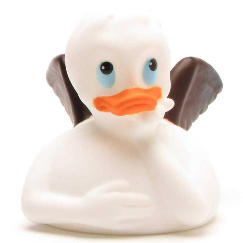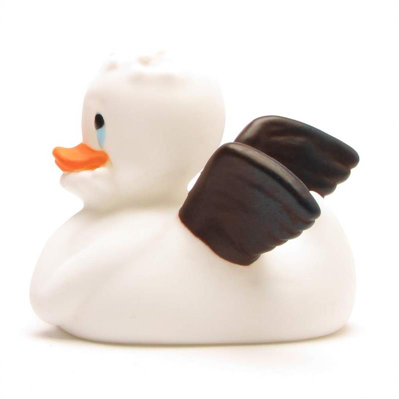 Die Gummiente ist aus hochwertigem Vinyl gefertigt und in strahlendem Weiß gehalten, dem Symbol für Reinheit und Unschuld. Kontrastreich hebt sich ihr schwarzer Flügel ab, der sie zu einem einzigartigen Blickfang macht. Mit einer Hand unter dem Kinn, wirkt die Engel-Badeente nachdenklich und fügt einen Hauch von Mystik zu deinem Bad hinzu.