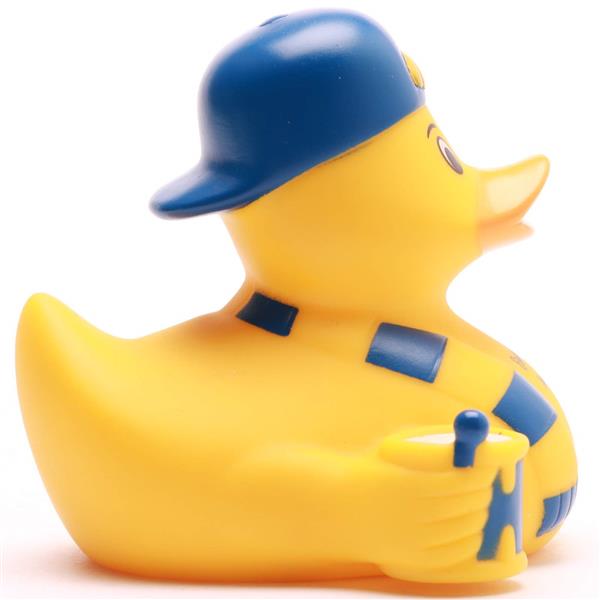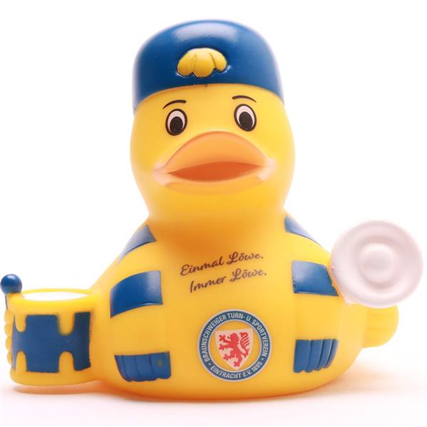 Diese Badeente ist bereit für den nächsten Anpfiff – und zwar direkt in deiner Badewanne. Die Quietscheente im Eintracht-Braunschweig-Look macht sofort klar, für welchen Verein ihr Herz schlägt. Mit blau-gelbem Outfit, passender Cap und dem Fanspruch „Einmal Löwe. Immer Löwe.“ bringt sie echtes Stadionfeeling ins warme Wasser. In der einen Hand das Megafon, in der anderen die Trommel – dieses Quietscheentchen weiß ganz genau, wie man richtig Stimmung macht.