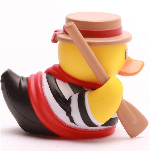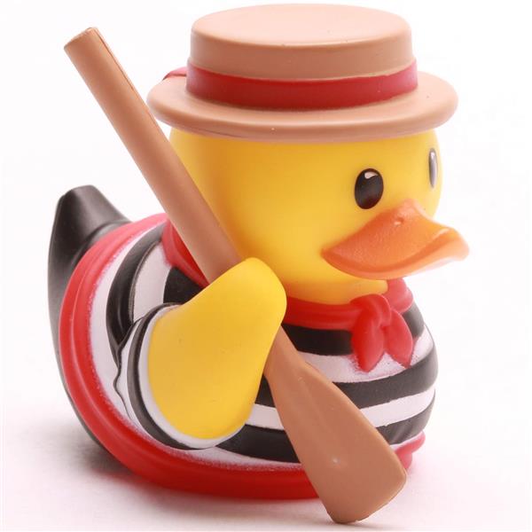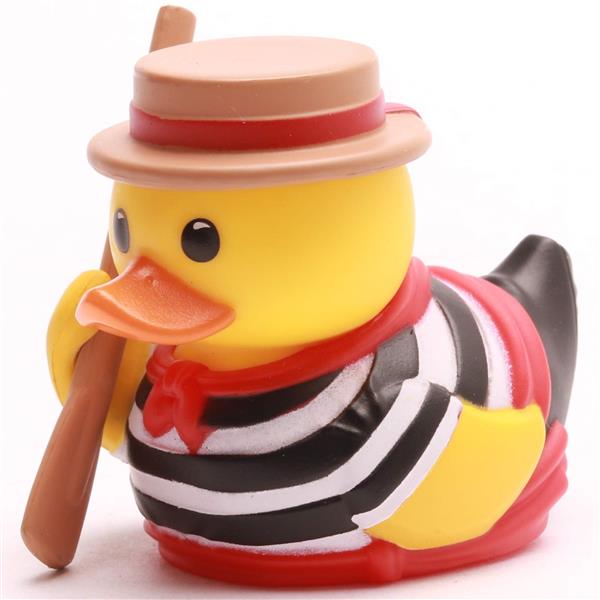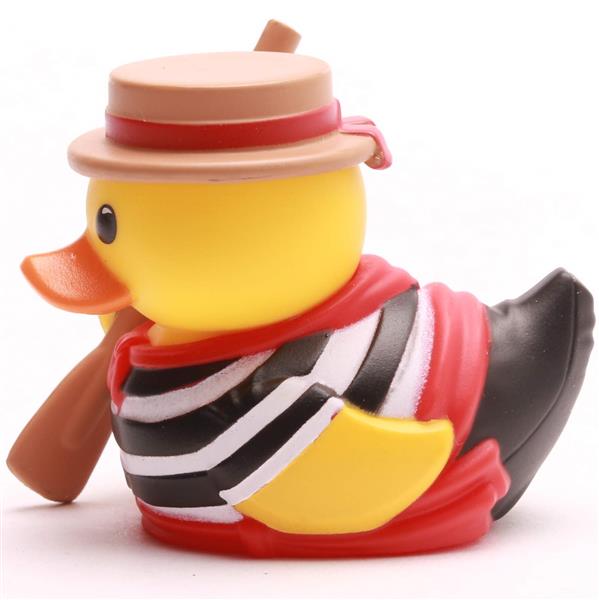 Mit dieser Mini-Badeente kommt sofort Urlaubsfeeling auf – direkt aus Venedig zu dir nach Hause. Die kleine Quietscheente Italy ist als Gondoliere verkleidet und bringt italienischen Charme in jede Sammlung. Mit dem klassischen schwarz-weißen Ringelshirt, dem roten Halstuch, Strohhut mit rotem Band und einem Paddel in der Flügelhand wirkt sie, als wäre sie gerade dabei, eine Gondel durch die Kanäle zu steuern.